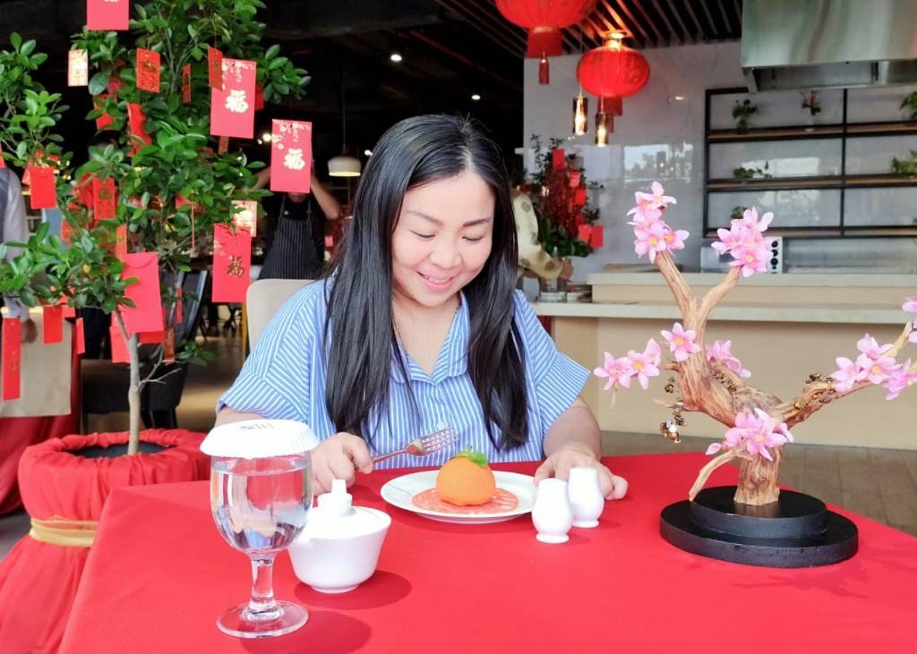 Menurut Yussi, Mandarin Golden Dome Cake dipilih sebagai signature dessert karena tampilannya yang unik dan sarat makna. Cake mousse cokelat lembut ini dilapisi cokelat berwarna oranye keemasan dan dibentuk bulat menyerupai jeruk mandarin buah utuh yang secara tradisional melambangkan kemakmuran, keberuntungan, dan kelimpahan dalam budaya Tionghoa.